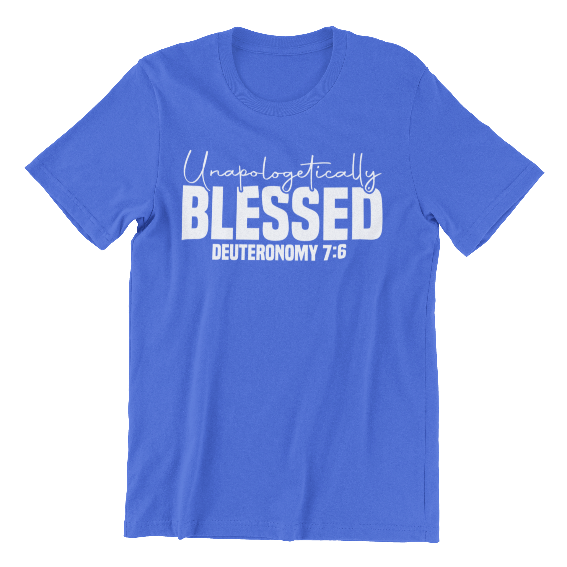 Our "Unapologetically Blessed" short-sleeved crewneck T-shirt is made of 100% comfortable cotton and vertically displays the design from top to bottom. Graphic and text size may appear slightly smaller as shirt size is increased.